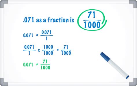 0.071 As A Fraction. Write down the number as a fraction of one: 0.05 = 0.05 / 1 step 2: