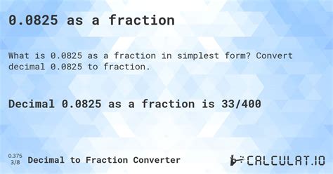 0825 As A Fraction. Multiply both top and bottom by 10 for every number after the decimal point: 33/40/ 1650 as percentage of 20000?