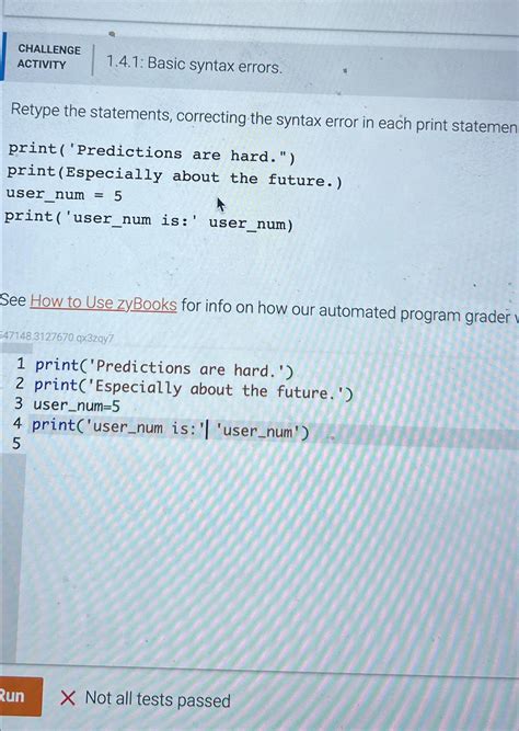 Forgetting to end a statement with a. Retype the statements, correcting the syntax error in each printstatement. Print ('predictions are hard.)print (especially about the future.)user_num. Retype the statements, correcting the syntax error in each print statement. Web ibrary > cs 111: Program design i home > 1.4: Retype the statements, correcting the syntax error in each print. Print('predictions are hard.) print (especially about the future. Web zybooks 1.4 errors and warnings. Print ( 'predictions are hard.