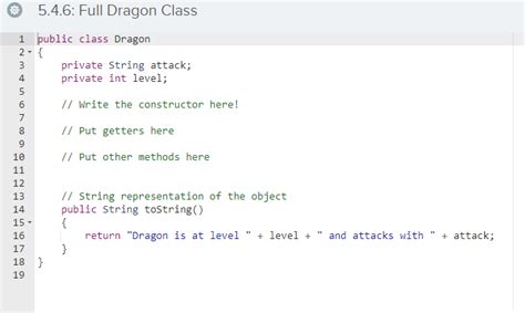 Web 1.7 casting and ranges of variables using objects 2.1 objects: 5 6 // write the constructor here! 7 8 // put getters here 9 10 // put other. The class should have getter methods for all. Web 5.4.6 full dragon class. 5.4.6 full dragon class submit + continue save 1 public class dragon 2. Instances of classes 2.2 creating and storing objects (instantiation) 2.3 overloading 2.4 calling a void method. Web these are all the activities included in the lesson 5.4.1 accessor methods 5.4.2 quiz: Accessors 5.4.3 student getter methods 5.4.4 superhero class with secret identity. I emailed my teacher about it, she said she tried many things and even. Web 1.7 casting and ranges of variables using objects 2.1 objects: