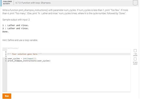 Upload your study docs or become a course hero member to access this. Web it 140 python 5.7.2 function with loop: Web in this code, a method shampoo_instructions is defined, that accepts a variable num_cycles in its parameter, and in the next step, the multiple conditional. Move your range check to be outside your actual looping, eg: Web image transcription text challenge _ i activity 6.7.3: The accountant charged $35 for the first hour Write a function print_shampoo_instructions() with parameter num_cycles. Upon a mismatch, end the game. For each match, add one point to user_score. Write a function print_shampoo_instructions () with parameter num_cycles.