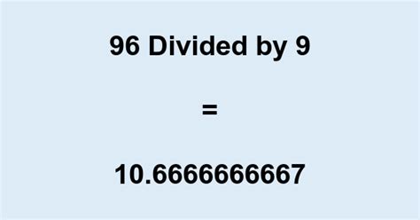 96 Divided By 9. Web divide two numbers, a dividend and a divisor, and find the answer as a quotient with a remainder. Web in algebra, a quadratic equation (from latin quadratus 'square') is any equation that can be rearranged in standard form as where x represents an unknown value, and a, b, and c represent known numbers, where a ≠ 0.