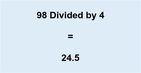 98 Divided By 4. 98 divided by 4 in decimal = 24.5. The answer will be detailed below.
