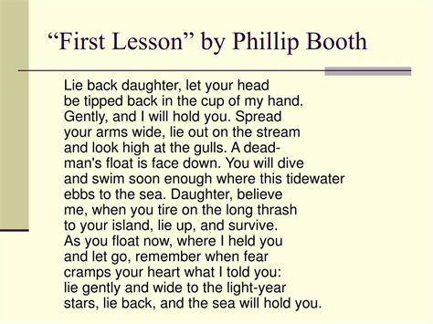 This is true for any situation,. Web first lesson by philip booth original language english lie back daughter, let your head be tipped back in the cup of my hand. It empowers the young one to move ahead in life against odds. Web the first lesson by philip booth is a lesson in life skills. Web first lesson by philip booth lie back, daughter, let your head be tipped back in the cup of my hand. Web this lesson guides students through close readings of the poems, first lesson by philip booth and those winter sundays by robert hayden using google drive or microsoft. Web the best poem of philip booth first lesson lie back daughter, let your head be tipped back in the cup of my hand. Web first lesson lie back, daughter, let your head be tipped back in the cup of my hand. A fathers encouragement is essential to the development and learning process of a child. Let your head be tipped back in the cup of my hand. Web first lesson lie back, daughter, let your head be tipped back in the cup of my hand.