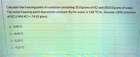 (density of solution = 1.04gml −1k f=1.86 k kgmol −1) medium solution verified by toppr molarity of kcl solution =1 m this means 1 mole (or 74.5 g) of kcl is dissolved in 1 l (or 1000 ml) of solution. It is not registered for current pesticide use in the u.s., but approved pesticide uses may change periodically and so federal, state and local authorities must be consulted for. Macneil, gargi basu ray, and derek g. Note that \(cacl_2\) is substantially more effective at lowering the freezing point of water because its. Mass of solution=density of solution×volume of solution Web calculate the freezing point of a molar aqueous solution of kcl. Web because the freezing point of pure water is 0°c, the actual freezing points of the solutions are −22°c and −30°c, respectively. Web what is the freezing point of a solution containing 6.5 % kcl by mass (in water).? Web freezing point depends upon the attraction between the molecules (intermolecular attraction) of the liquid. Thus the freezing point decreases after adding salt.