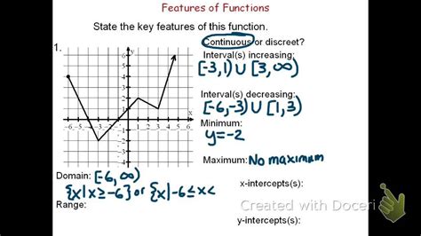 Web key features of functions domain and range. To find it algebraically, set y = 0. Its values are given in the table below. Web for a function that models a relationship between two quantities, interpret key features of graphs and tables in terms of the quantities, and sketch graphs showing key features given a verbal description of the relationship. Which of the features are shared by \blue {f (x)} f (x) and \pink {g (x)} g(x)? Let's explore how we can graph, analyze, and create different types of functions. Web a function is like a machine that takes an input and gives an output. Its formula is given below. Web function, in mathematics, an expression, rule, or law that defines a relationship between one variable (the independent variable) and another variable (the dependent variable). Domain & range section 3.3 activity 3.3 features of functions key 3.3 rsg ws domain & range video: