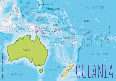 Oceania political map with countries. English labeling. Region