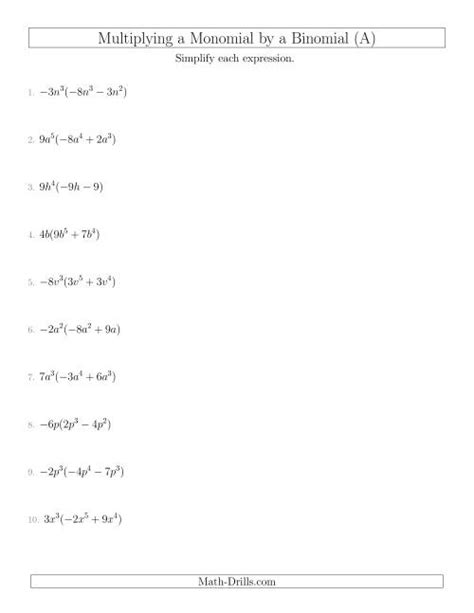 Web multiplying binomials worksheet the calculator a b (ax + b) answer (3 x + 2) (2 x + 4) = 6x2 + 16x + 8 step 1) multiply the first, outer, inner and last pairs. Web multiplying a binomial by a monomial follows certain rules, using the distributive and associative properties. Web this mystery puzzle is a great way for students to practice multiplying a binomial by a trinomial. Web 5 rows multiplying monomial is a method for multiplying a monomial with a polynomial. Web multiply monomials by polynomials get 3 of 4 questions to level up! Multiply the monomial with the first term of the binomial. Worksheets for practicing multiplying monomials, binomials, trinomials, and polynomials with four or more terms, with and without exponents. Lesson 4 multiplying monomials by polynomials multiplying monomials multiply monomials multiplying monomials by polynomials: Then you can use the distributive property to multiply each term in the first binomial by each. Then you can use the distributive property to multiply each term in the first binomial by each. In this case, 10 times 5 = 50 2.