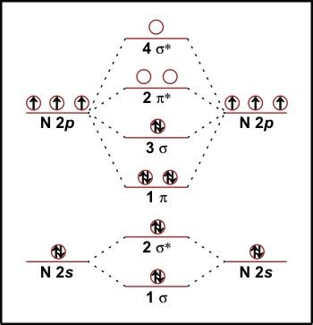N2 2- Mo Diagram. Mo theory also predicts 3 bonds, which match the experimental very short strong bond. Try the following mo's on your own, and then check with the answers.