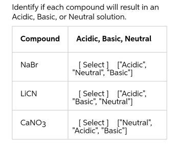 Web find answers to questions asked by students like you. Web the solution will be acidic. Web to tell if nh4br (ammonium bromide) forms an acidic, basic (alkaline), or neutral solution we can use these three simple rules along with the neutralization reaction that formed. Web is an aqueous solution of nabr acidic, basic, or neutral? Web to tell if nai (sodium iodide) forms an acidic, basic (alkaline), or neutral solution we can use these three simple rules along with the neutralization reaction that formed nai. Web to tell if nabr (sodium bromide) forms an acidic, basic (alkaline), or neutral solution we can use these three simple rules along with the neutralization reaction that formed nabr. 11) do you expect nacho3 ( or n a cho3) to be acidic, neutral, or basic when dissolved in pure…. Acid strength increases down a family due to size. Web to tell if nano3 (sodium nitrate) forms an acidic, basic (alkaline), or neutral solution we can use these three simple rules along with the neutralization reaction that formed nano3. Hydrohalic acids/ binary acids (2 elements) rules. Sodium bromide sodium is an element of group 1 having atomic number 11 and bromine is of group 18 element.