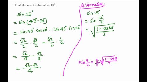 Web trigonometry find the exact value sin (15 degrees ) sin(15°) sin ( 15 °) split 15 15 into two angles where the values of the six trigonometric functions are known. Web the number π (/paɪ/; Web find the exact value sin(105) step 1 apply the reference angleby finding the anglewith equivalenttrig values in the first quadrant. Make the expression negative because sine is negative in the fourth. Web sin ( 15 ∘) = 3 − 1 2 2. Now we know that sin 15 > 0 and cos 15 > 0, therefore. We could also find the sine of 15 degrees using sine (45° − 30°). Step 2 split into two angleswhere the values. Web an exact value for sin 15∘ sin 15 ∘. Web the exact value of is. Web sin(315) sin ( 315) apply the reference angle by finding the angle with equivalent trig values in the first quadrant.
