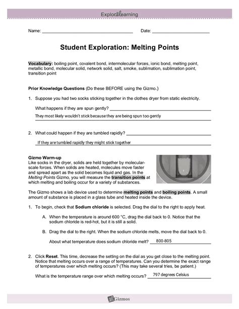 Melting points gizmos student exploration: Melting points the solid transforms directly to a gas. Web prevent resits and get higher grades by finding the best notes & resources available, written by your fellow students at gizmos student exploration: Click on the sign tool. Web melting points gizmo™, you will measure the transition points at which melting and boiling occur for a variety of substances. Add the date to the document using the date option. Web student'exploration:'melting'points& & & vocabulary:&boiling&point,&covalent&bond,&intermolecular&forces,&ionic&bond,&melting&point,&. Using the gizmo, determine the sublimation point of carbon dioxide and record it in the table under. Web melting points gizmo, you will measure the transition points at which melting and boiling occur for a variety of substances. Melting points preview 2 out of 10 pages getting your document ready. Web gizmos student exploration: