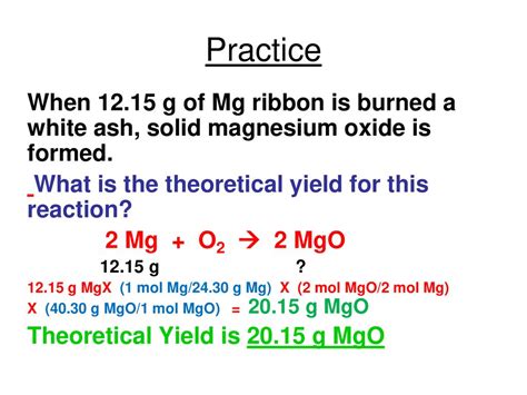 Web calculate the theoretical yield of mgo for each trial mass of mg for each trial: Web theoretical yield of mgo for trial 2 = 1.01 g. Web the ratio should be close to 1:1 as the formula of magnesium oxide is mgo. Mass magnesium = 2.39 g; 2 mg + o 2 = 2 mgo : Web if the theoretical yield is 19 grams, what is the percent yield of mgo? Web subtract the mass of the crucible and lid (row 1 in the chart) from the total mass of mgo, crucible, and lid (row 3 in the chart) to find the mass of magnesium oxide for each trial. Put values in above formula percent yield = 0.494 g/. Mass of mg = m r × number of moles of mg =. Web calculate the theoretical yield of mgo for each trial mass of mg for each trial: Web theoretical yield of mgo from reaction: