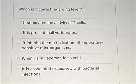 It is present in all vertebrates when rising, a person feels cold it increases the rate of antibody. It is a common cause of primary atypical pneumonia. Web which is incorrect regarding fever? Web which is incorrect regarding q fever: Rest and drink plenty of fluids. Web which is incorrect regarding fever? A)urinary frequency and pain and vaginal discharge. Web in the case of a high fever or a fever that causes discomfort, your care provider may recommend nonprescription medication, such as acetaminophen (tylenol,. Web call the doctor if the fever doesn't respond to the medication or lasts longer than three days. It is present in all vertebrates when rising, a person feels cold it increases the rate of antibody. 29) a.it is associated exclusively with bacterial infections.