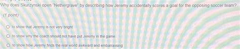 Why Does Skurzynski Open Nethergrave. To show how jeremy finds the real world awkward and embarrassing It also introduces the idea of jeremy feeling.